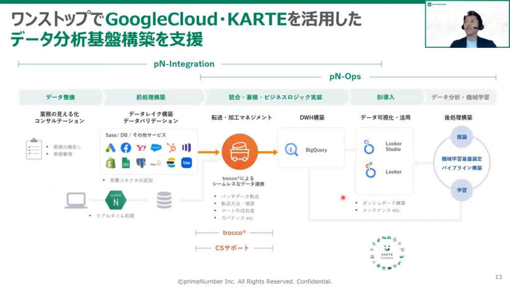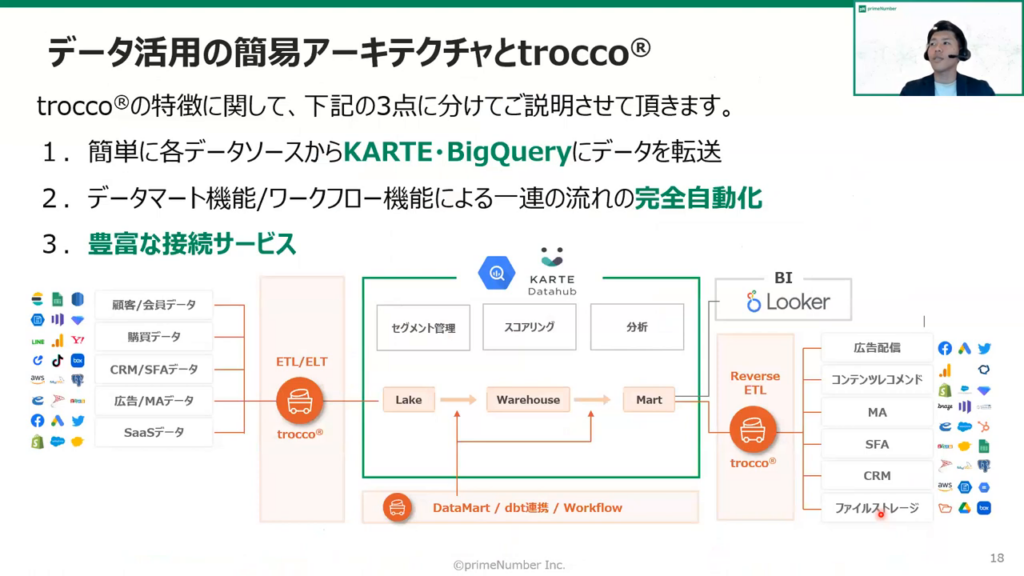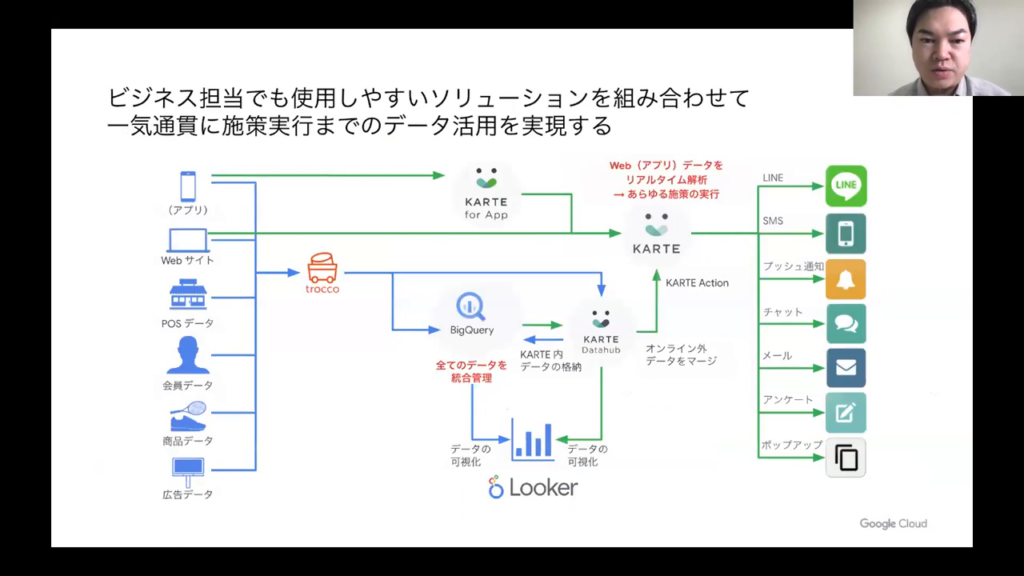 「Looker」によってデータを可視化し、「KARTE」で顧客分析施策を実現し、そして「TROCCO®」でデータを集約することで、データ分析基盤の構築と効率化が実現できます。