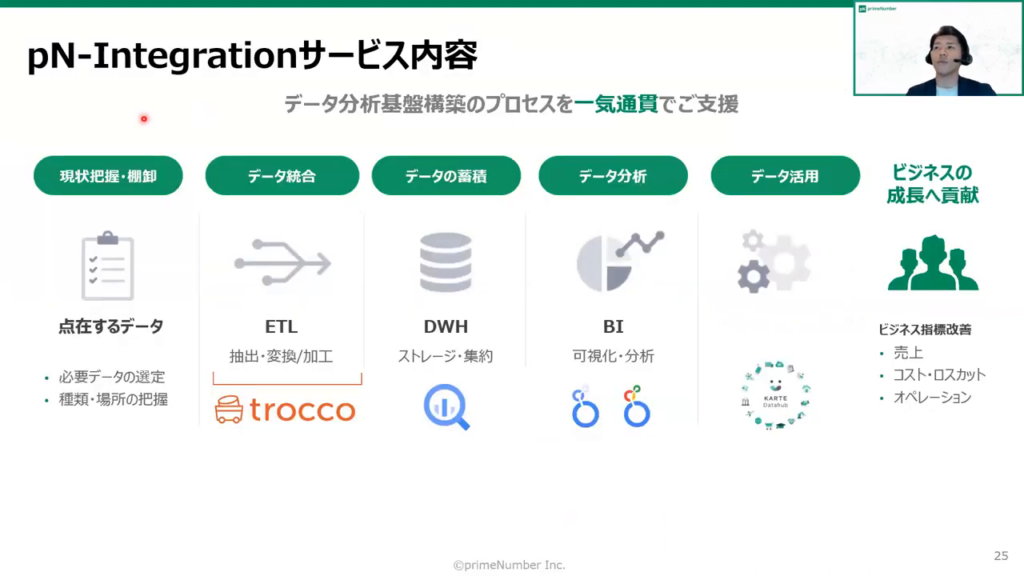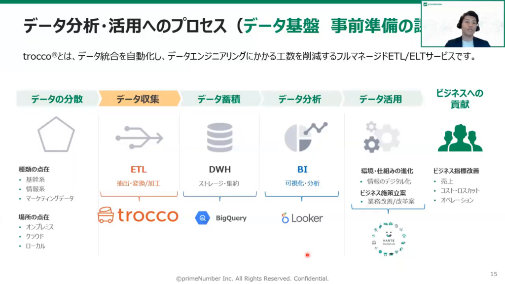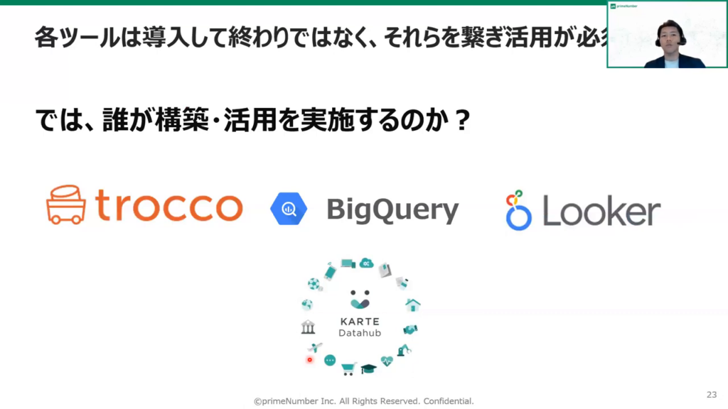 今回は、データの可視化・社内への活用推進を行うツールとして「Looker」、顧客分析施策を実現する「KARTE」、データを集約するツールとして「TROCCO®」をご紹介します。また、それらのツールを組み合わせて構築するデータ分析基盤を構築するメリットについても触れます。