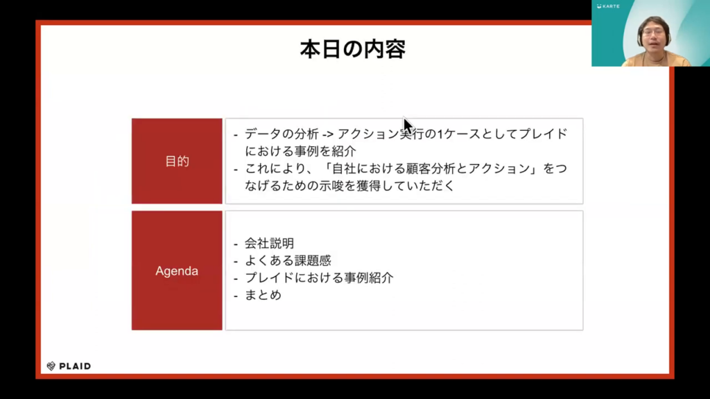 本セミナーでは、KARTE・Lookerを活用して顧客分析施策の実現および企業内でのデータ分析環境の浸透を最大化する方法に焦点を当てます。データ分析基盤は構築して終わりではなく、「活用」されることで迅速に適切な意思決定を行えます。