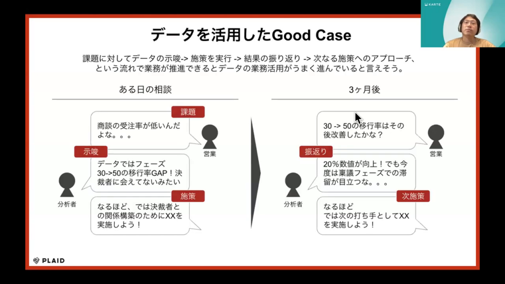 例えば、営業の方から「商談の受注率が低い」という相談があり、それに対し分析側がデータをもとに「商談のフェーズが30から50への移行率に大きなギャップがある。そして、その原因は決裁者に会えていなさそうだ」という示唆を与えたとします。そこで、その示唆を基に「決裁者との関係構築のための施策」を実施します。