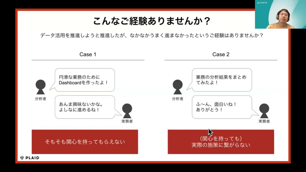 「分析結果を円滑な業務推進のためにダッシュボードにまとめて提示したけれど、興味を持ってもらえなかった」、「分析結果を提示したものの、それが実際の業務改善に繋がらなかった」という事例があると思います。