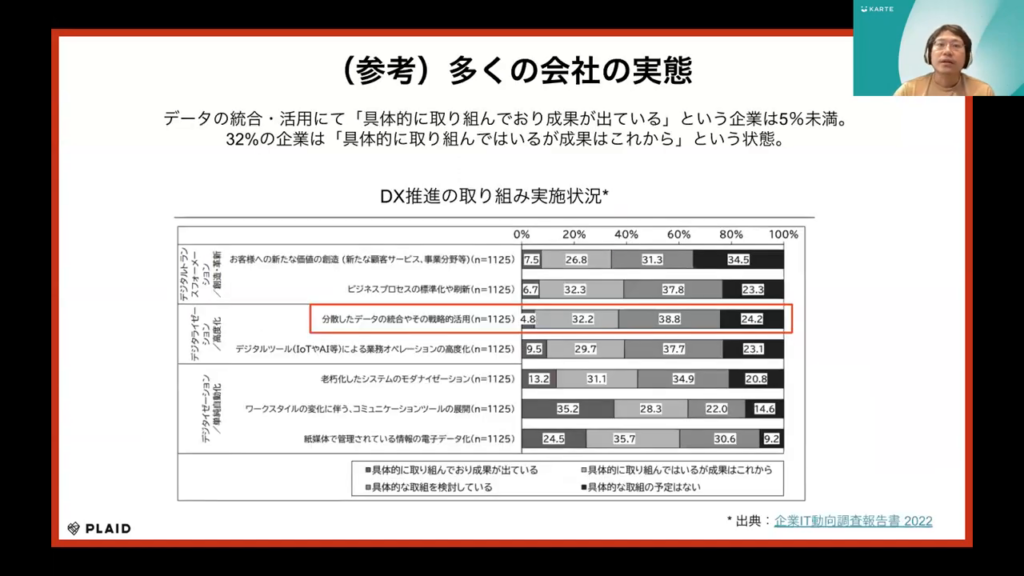 石塚氏:「データの統合や戦略的活用について調査した結果、具体的に取り組み成果を上げている企業は全体の5%に過ぎません。32%の企業が現在取り組み中で成功することを予期しています。