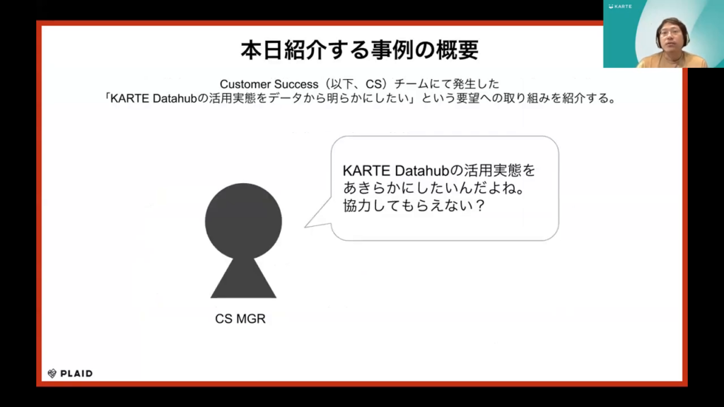石塚氏:「Customer Success(CS)チームが「KARTE Datahubの使用状況を具体的なデータから理解したい」という要望に対する取り組みについて解説します。