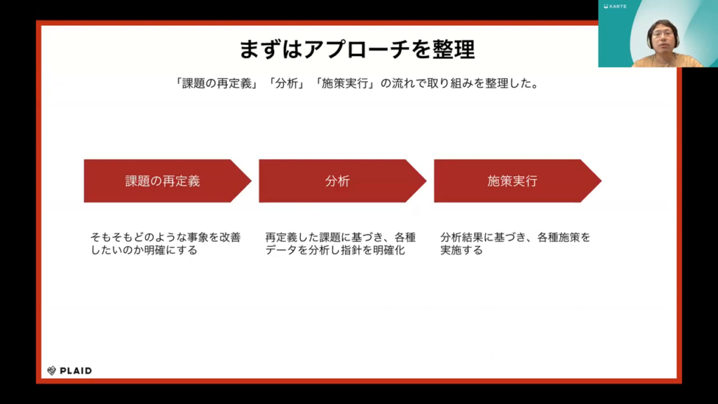 石塚氏:「まずは、私たちのアプローチについて整理します。大きく分けて「課題の再定義」、「分析」、「施策実行」の3つのステップで取り組んでいます。