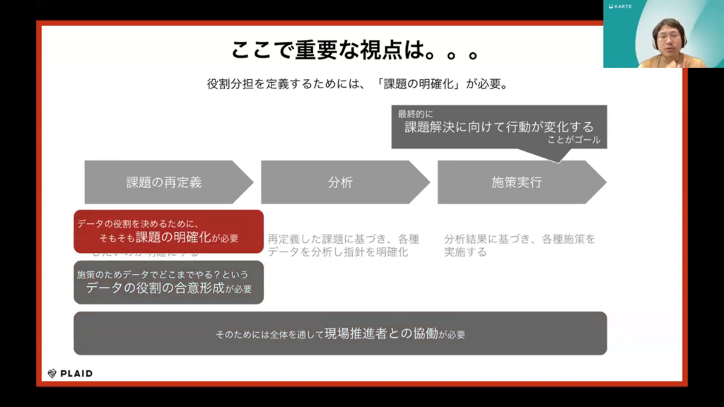 最終的には、課題解決に向けて行動を変えることがゴールです。そのためには、全体として現場推進者との協働が必要です。その上で、データと現場のどちらがどの範囲までを担当するのか、役割の明確化が重要となります。