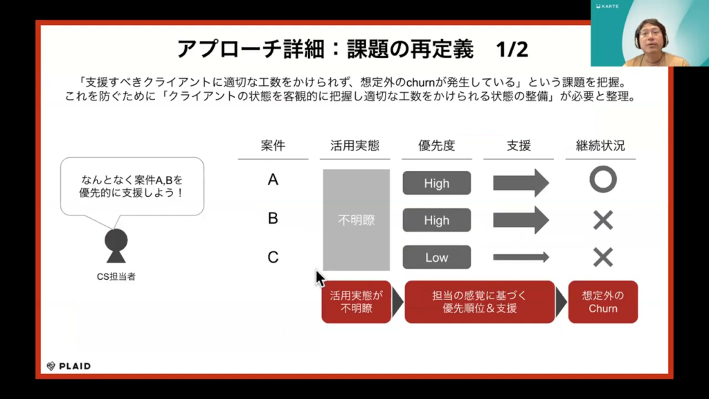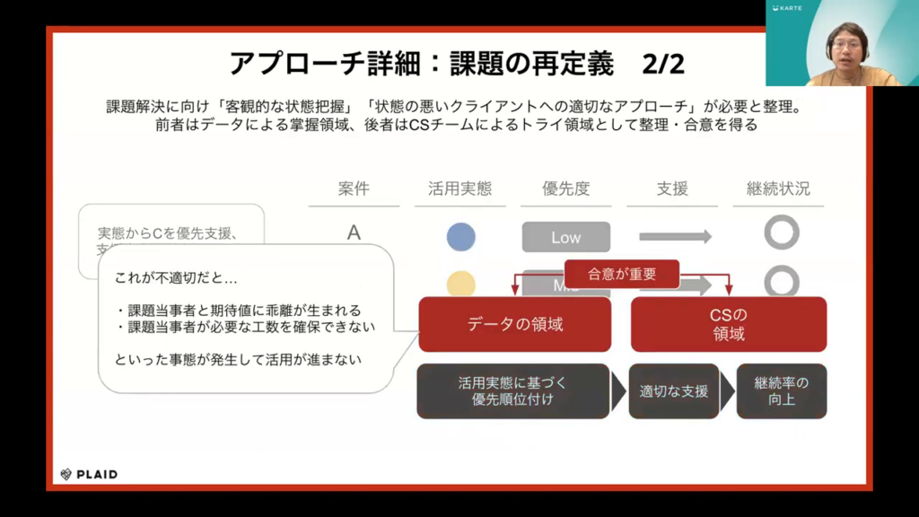 石塚氏:「課題解決の具体的なアプローチの一部として、”客観的な状態把握”と”状態が好ましくないクライアントへの適切なアプローチ”が必要であり、それぞれをデータ分析とCSチームの活動領域として整理しました。