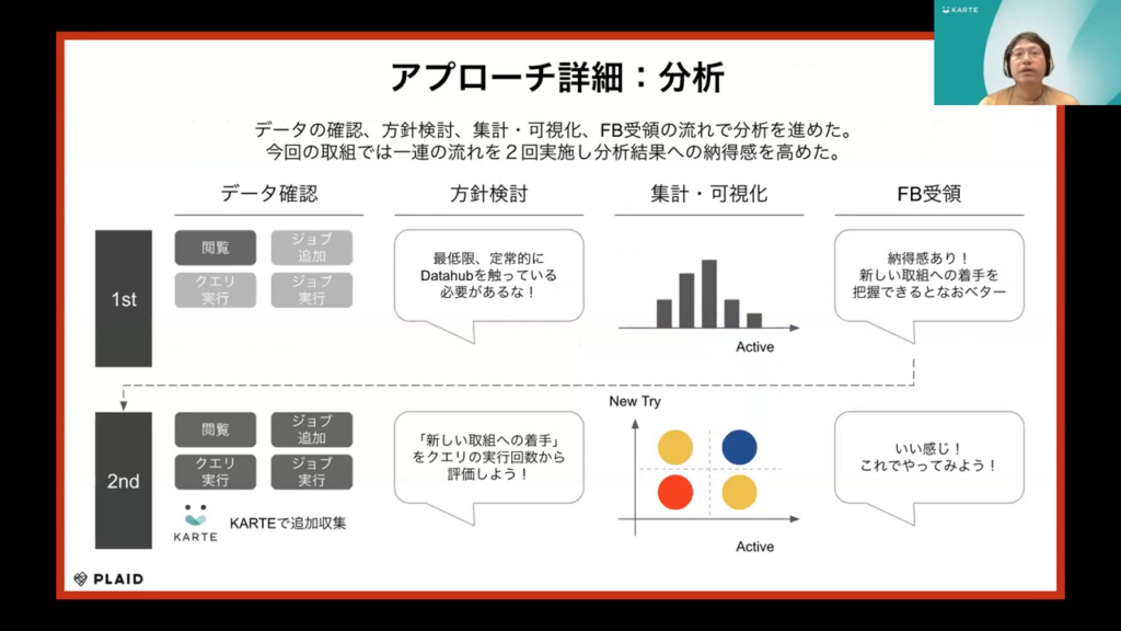 石塚氏:「今回の取り組みは、データの確認から始まり、それに基づいて分析方針を検討し、その方針に従って集計や可視化を行い、さらにフィードバックを得るという一連の流れを二回実施しました。これにより、納得感のある分析結果を得ることができました。