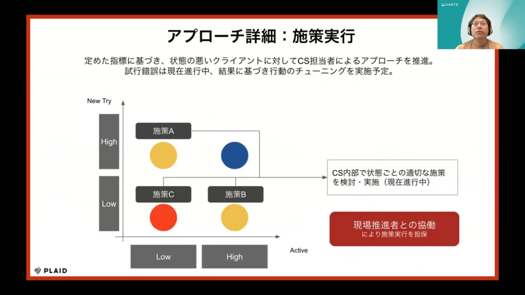 石塚氏:「指標に基づいて、パフォーマンスが低下しているクライアントに対して、カスタマーサービス担当者が関与する方法を進めています。この方法の効果を検証しつつ、結果によって行動計画を調整する予定です。