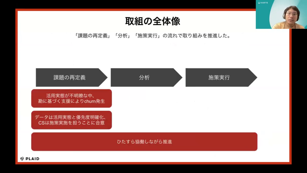 「課題の再定義」では、何を改善したいのかを明らかにしています。次に「分析」では、再定義した課題に基づきデータを分析し、改善への指針を明確化しています。最後の「施策実行」では、分析結果に基づき施策を実施しています。