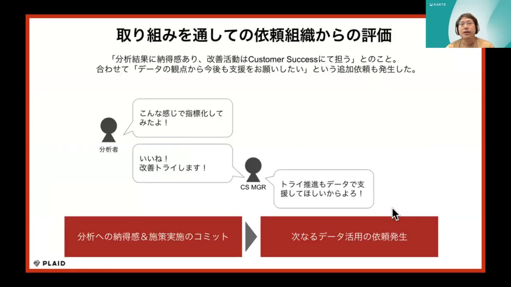 石塚氏:「私たちの取り組みに対して依頼組織からは、「分析結果に納得感があり、改善活動はCustomer Successにて担当」という評価を受け、さらには「データの観点から今後も支援をお願いしたい」という追加の依頼もありました。