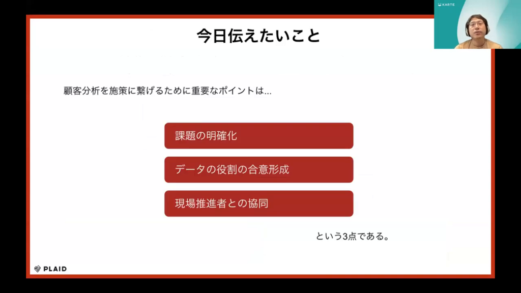 石塚氏:「主に顧客分析を効果的に活用し、それを具体的なアクションに繋げるポイントは三つあります。課題の明確化、データトラックの割り当てに対する全員の合意形成、そして現場での推進者と共に進めていくことです。