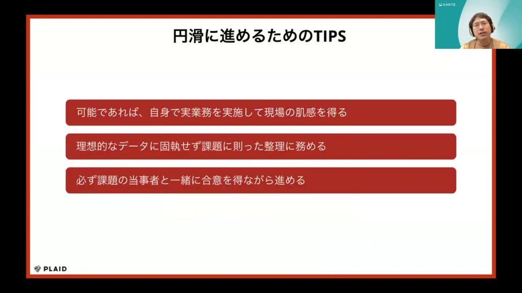 次に、データは万能な解決策ではないことを理解します。理想的なデータがない場合でも、課題が何であるかを明確にし、課題に基づいてデータの整理を進めることが大切です。