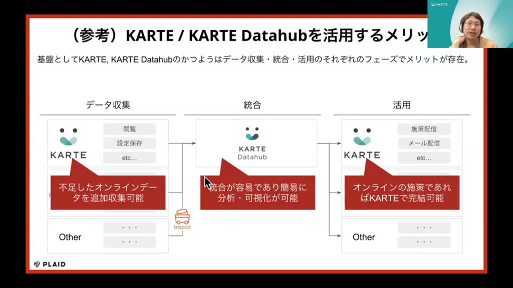 一言で表現すれば、データ収集、統合、活用の一連のフローが充実します。それぞれのプロセスにおいて、KARTE / KARTE DataHubを使うことは、一定のメリットが得られるでしょう。