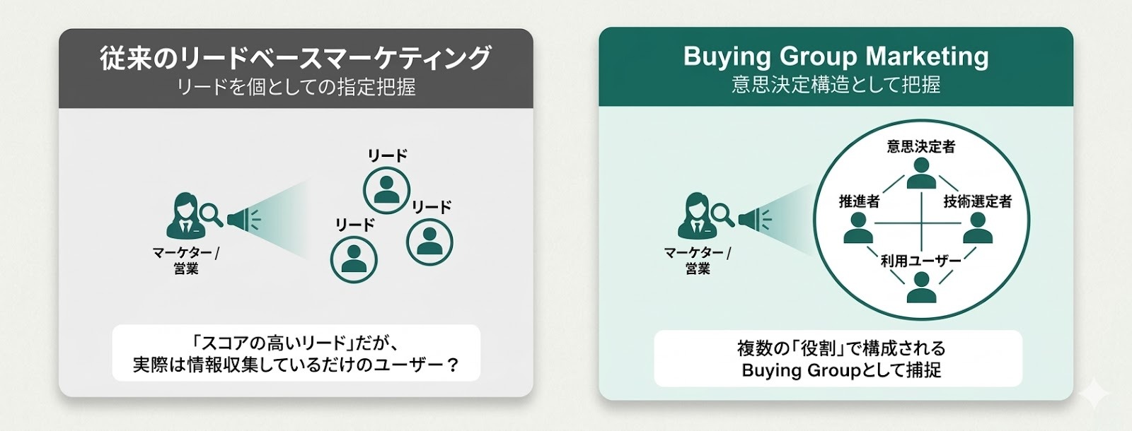 これまでのマーケティングは、1人のリードを獲得し、そのリードに対して施策を打ち、反応を見て追客するという「リードベース」の考え方が主流でした。しかし、実際のB2Bの購買意思決定は、一人の担当者だけで決まることはありません。