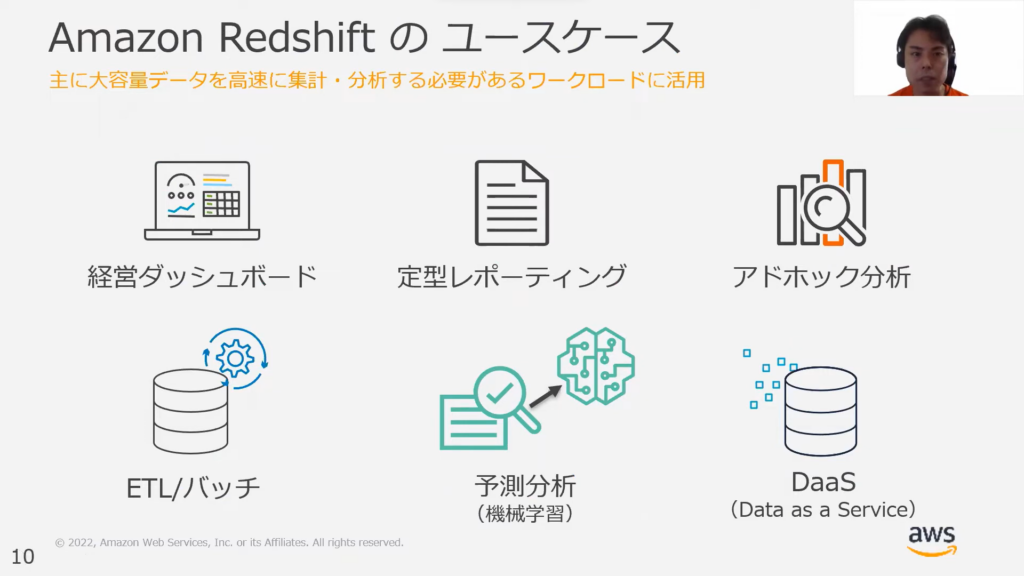 最近はRedshift MLが機械学習に対応しているため、予測分析も可能ですし、アプリケーションのバックエンドとしてDaaSを用いることもできます。