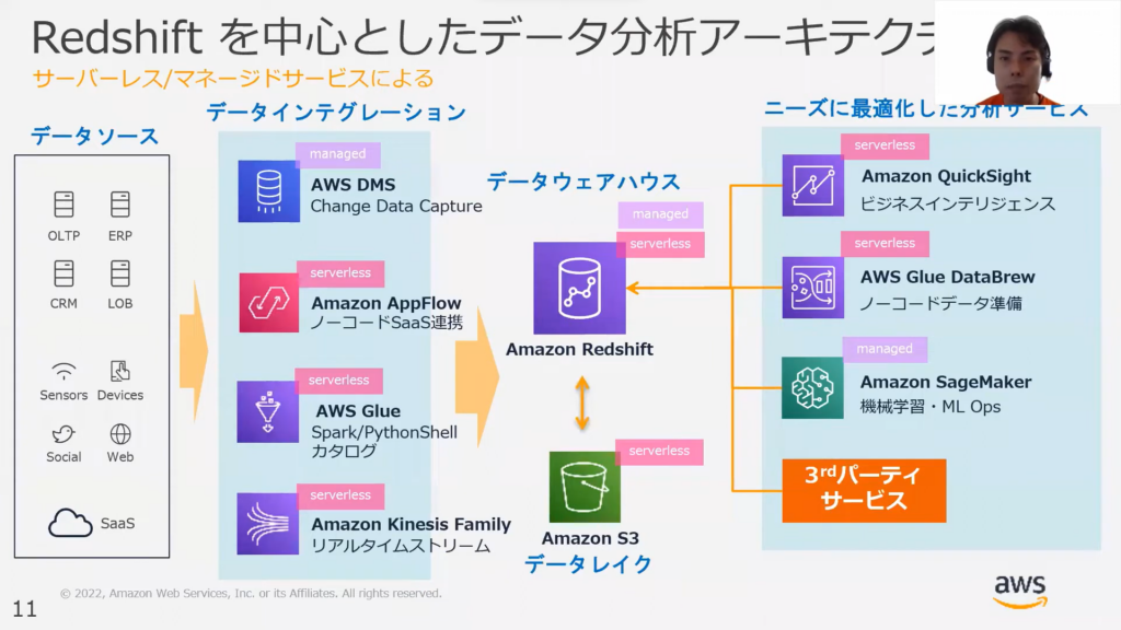 たとえば、Amazon QuickSightというサーバーレス型のBIツールや、AWS Glue DataBrewというノーコードでデータの準備をできるツールもあります。また、MLOpsを実現するた目のAmazon SageMakerがあり、RedShiftのデータからサードパーティサービスからトークをつないで他のデータサービスと連携することも可能です。」