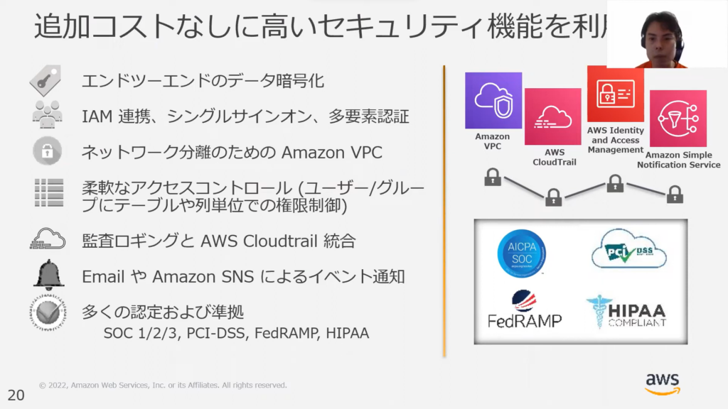 それ以外にも、Amazon VPCを用いたネットワーク分離も可能ですし、アクセスコントロール機能や監査ロギング機能などがデフォルトで利用可能です。」