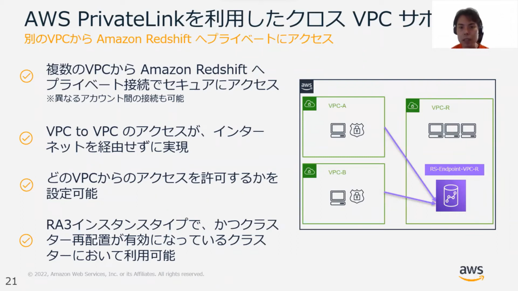 甲谷氏:「RedShiftに最近追加された機能としてPrivateLinkを利用したクロスVPCサポートというものがあります。