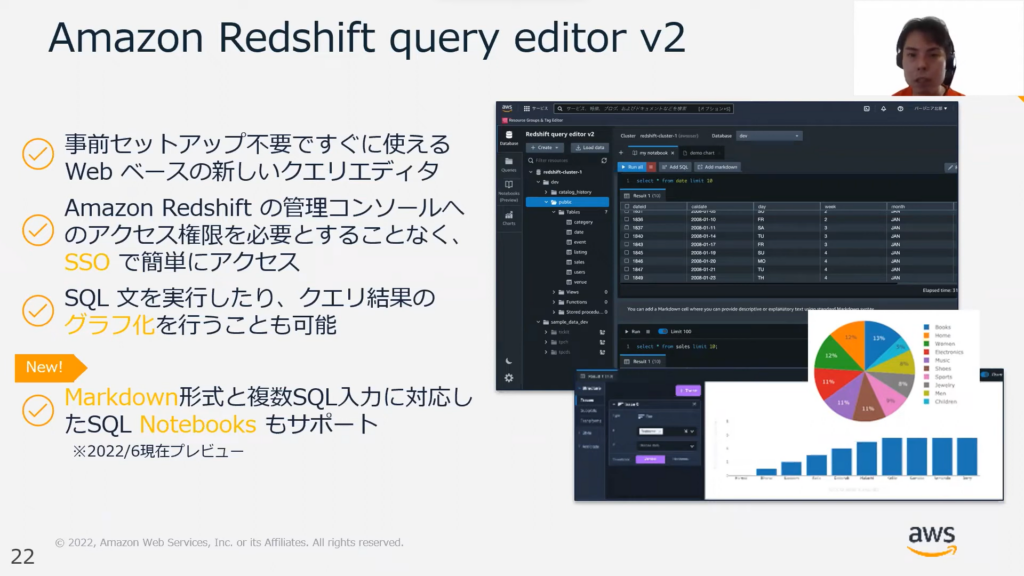 甲谷氏:「Easy analytics for everyoneの観点で言いますと、RedShift query editorが挙げられます。