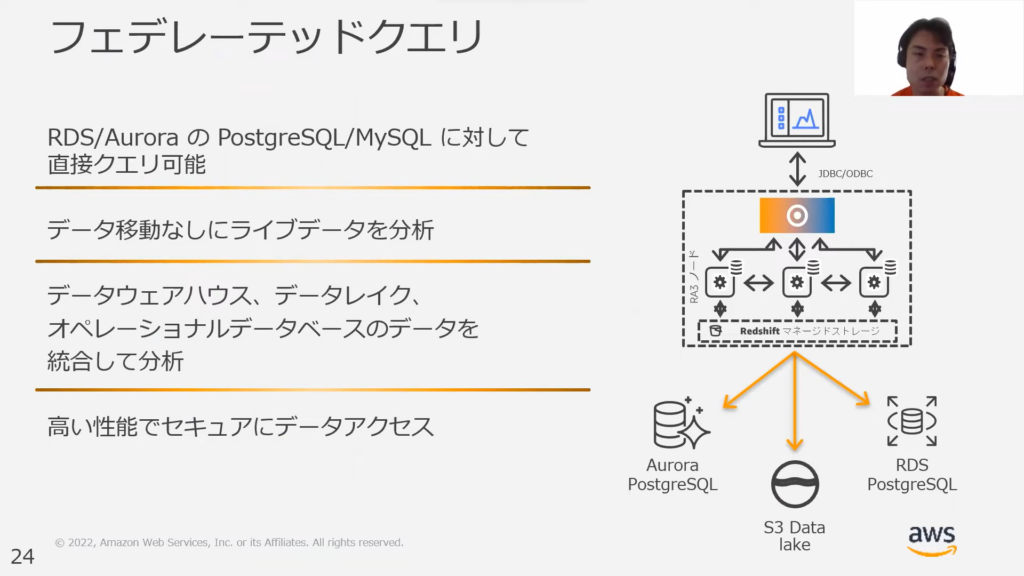 甲谷氏:「現状、RedShiftはRDS/AuroraのPostgreSQL/MySQLに対して直接クエリの実行が可能ですが、フェデレーテッド機能を用いることでSQLのみでデータの移動が可能です。」
