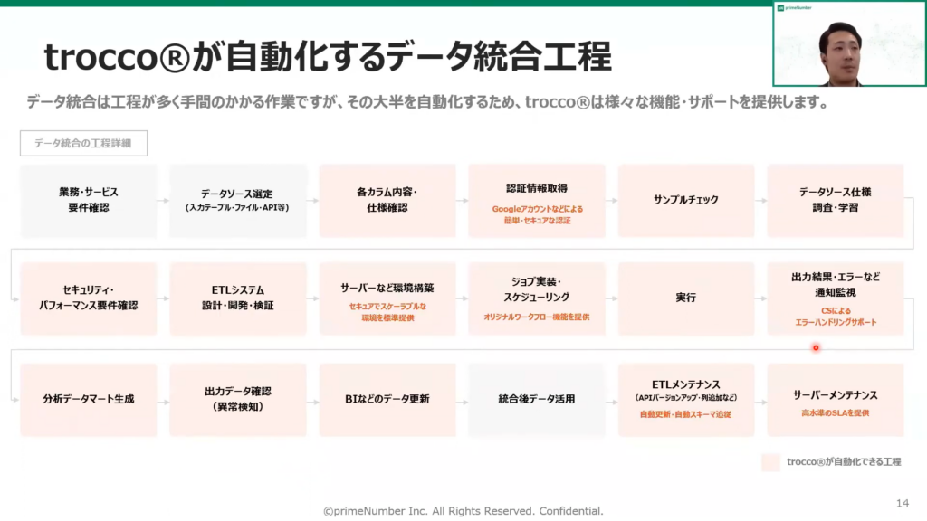 薬丸:「データ統合には大別して構築と運用、保守がありますが、たとえば構築の部分ではTROCCO®を使っていただくことで個別のETLプラインを作る必要がない、個別のサーバーを構築する手間が省ける、といったメリットがあります。