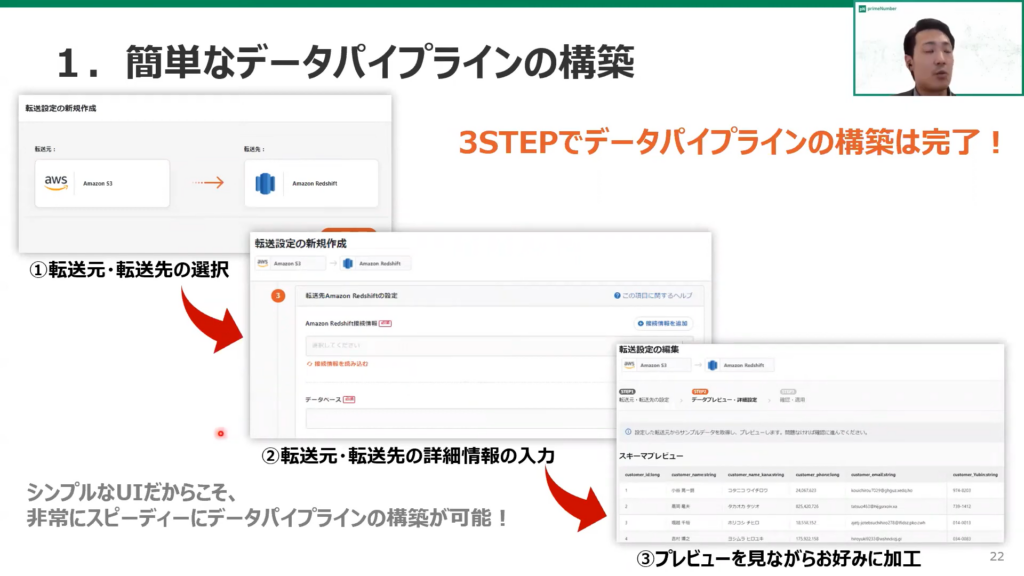 実際に、データパイプラインの設定をする場合、3ステップですべてのパイプラインが構築できます。