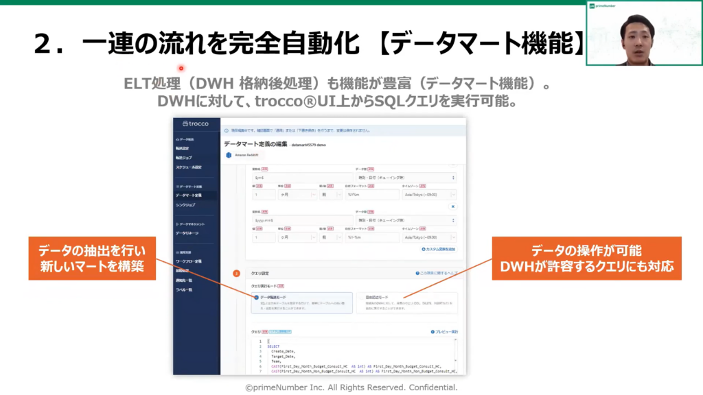 大別して2つモードがあり、1つ目はデータ転送モードという、データの抽出をすることにより新しいデータマートを構築するモードであり、2つ目は自由記述モードという、DDL文のようなデータの操作が可能でして、データウェアハウスで利用ができるクエリの実行が可能です。」