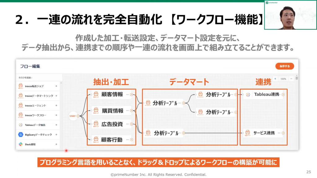 薬丸:「そして先ほど作った転送の設定およびデータマートをGUIで並べることにより一連のワークフロー作成が可能です。