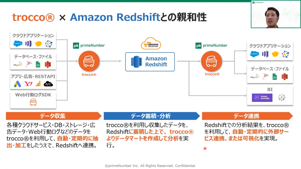 薬丸:「TROCCO®は各種クラウドサービスやデータベース系、ストレージ系、Web行動ログ等のデータを利用して自動的かつ定期的に抽出・加工した上でRedShiftに連携可能です。