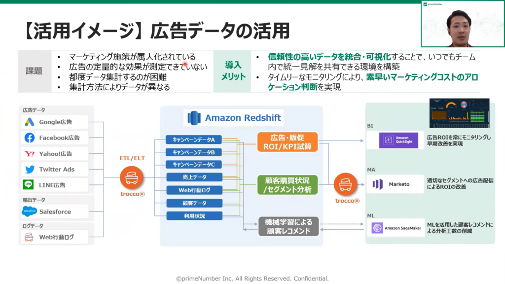 先ほどご説明のあったRedShiftで点在しているあらゆるデータを統合することが役割です。そしてデータが蓄積された上で可視化および分析されることでデータの活用につながります。」