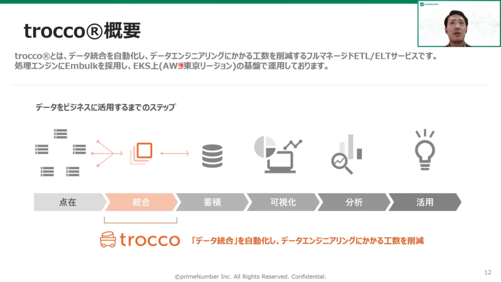 薬丸:「TROCCO®はデータ統合の自動化によりデータエンジニアリングにかかる工数を削減するフルマネージドETL/ELTサービスです。処理エンジンにはEmbulkを採用しており、EKS上の基盤で運用しています。
