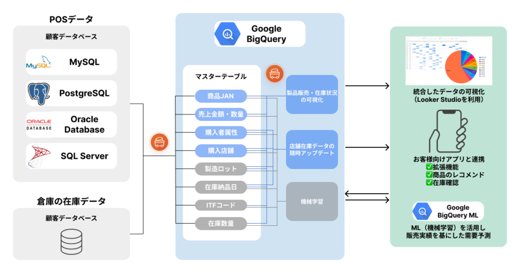複数のデータソースにあるデータを一元化し、管理することが重要です。本記事で取り上げた事例では、POSデータと倉庫データが異なるデータベースにありましたが、ETLツールを使用してGoogle BigQueryに一元化することで、総合的な分析や施策の立案・実行が可能になりました。