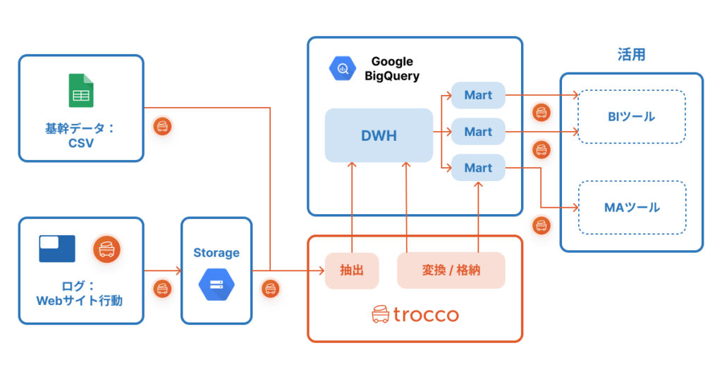 Google BigQuery内でデータマートを作成後、ここでもTROCCO®を使ってBIツールやMAツールに転送し、解析やマーケティング活動に活かせるようにしました。