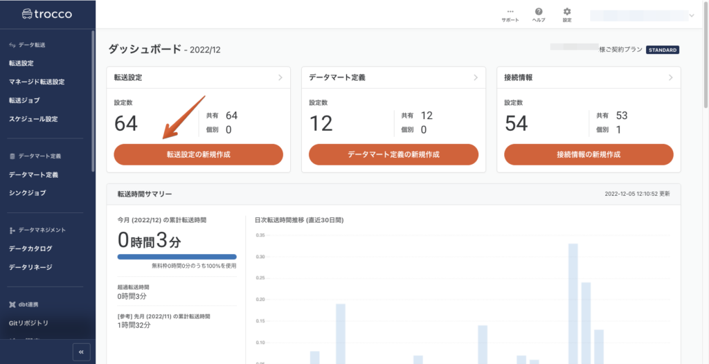 はじめにTROCCO®のトップ画面から「転送設定の新規作成」ボタンを押します。