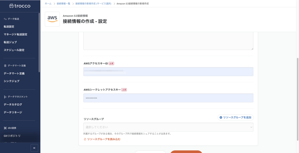 転送元のAmazon S3と同様に接続設定を行っていきます。