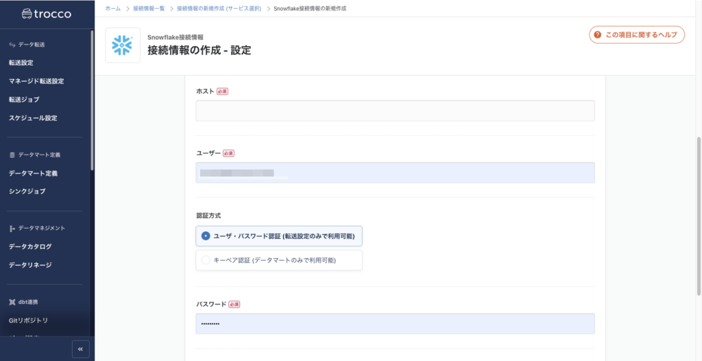 Snowflakeとの接続にはホスト名、ユーザー名とパスワードが必要です。
