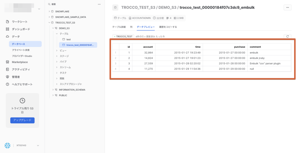 Snowflake側での操作は特に必要ありません。念のため、Snowflakeのコンソール画面からプレビューを取得してみるとたしかにデータが転送されていることが確認できます。