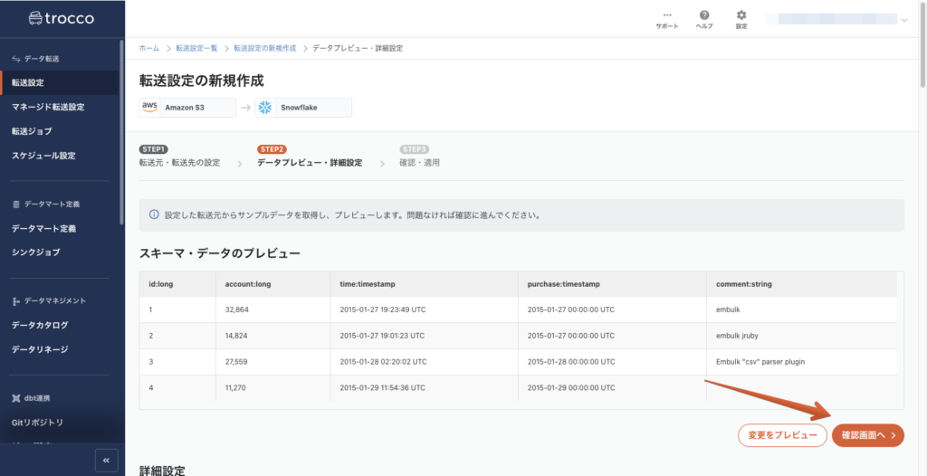 少し待つと、設定に基づいてAmazon S3からデータが取得され、プレビューが作成されます。問題なければ「確認画面へ」を押して設定を保存しますが、もし取得したいデータがプレビューに表示されていなければ再度転送設定画面に戻り、設定をやり直します。