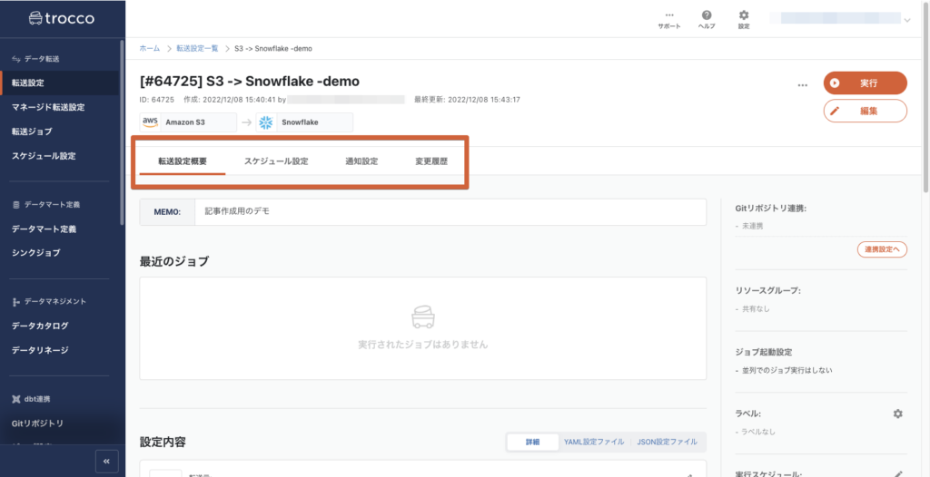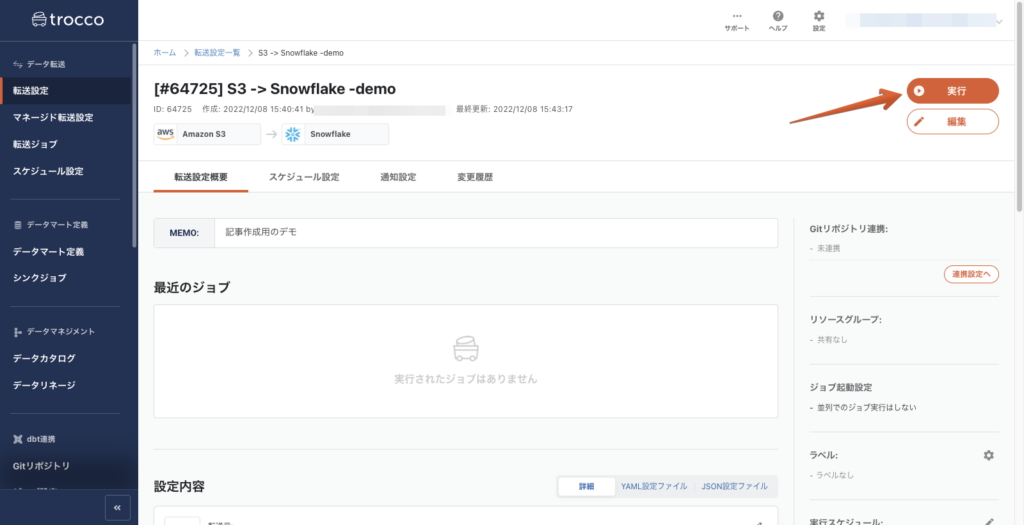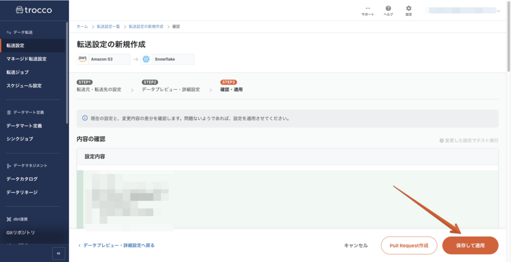今回は新規の設定作成なので特に確認する点はありませんが、既存の設定を編集した際にはこの画面で変更点がハイライト表示されます。TROCCO®には過去の設定を保存し、万が一変更によってエラーが発生してしまった際にも元の設定に復帰できるロールバック機能がありますが、確認して問題なければ「保存して適用」を押します。