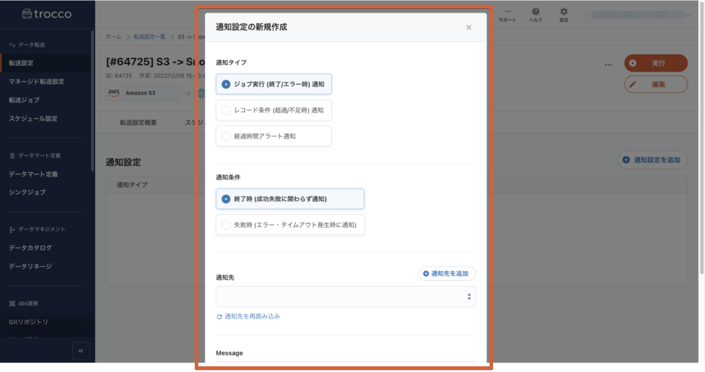 現在はE-mail通知とSlack通知に対応しており、通知の条件もエラー時のみだけでなく転送時間が不自然に長い、転送は成功したがデータの件数が不自然などを条件にして通知することが出来ます。