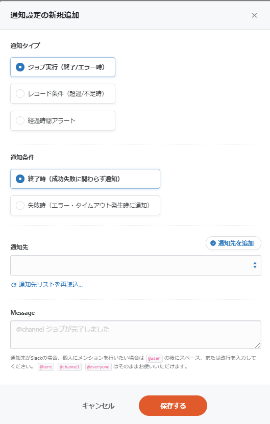 また必須の設定ではないですが、ジョブの実行ステータスに応じてE-mailやSlackに通知を行うことができます。