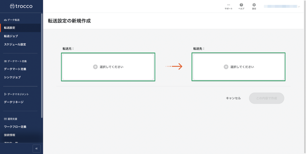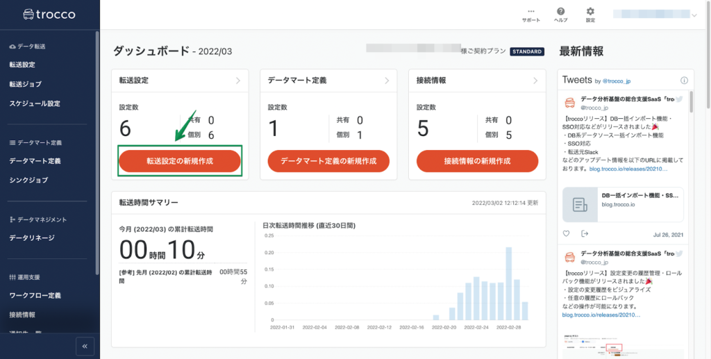 TROCCO®にアクセスして、ダッシュボードから「転送設定を作成」ボタンを押します。
