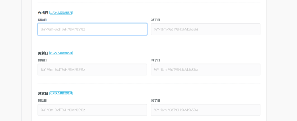 また、必須の設定ではないですが、作成日、更新日、注文日の設定によりデータを取得したい期間を絞り込むことができます。