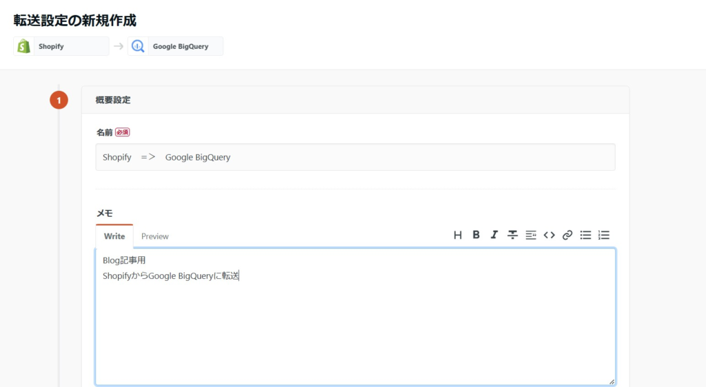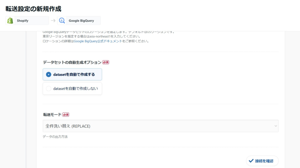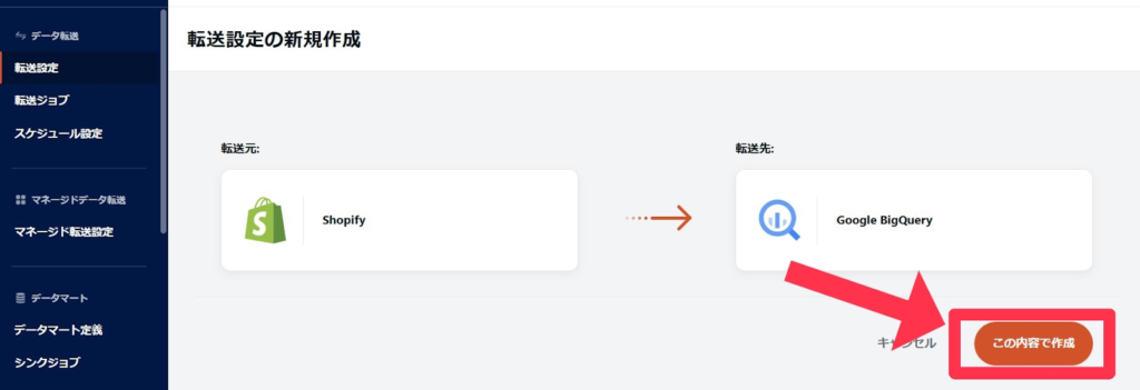 今回は転送元に「Shopify」、転送先には「Google BigQuery」をそれぞれ選択し、「この内容で作成」ボタンを押します。