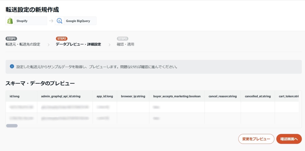 転送設定に従ってShopifyから転送するデータのプレビューが作成されます。