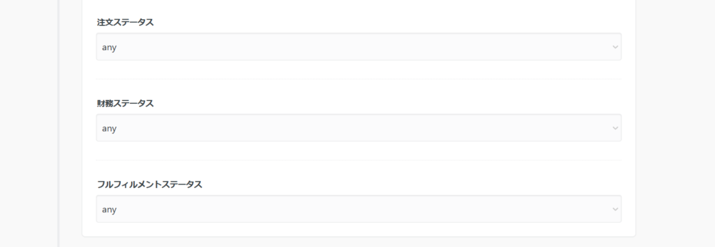 また、今回は注文ステータス、財務ステータス、フルフィルメントステータスを以下のように設定します。