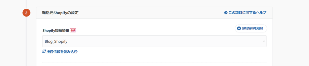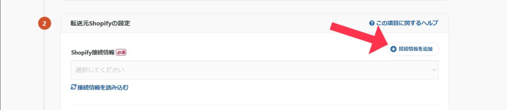 次にShopifyとの連携に関する設定をするために「転送元の設定」内の「接続情報を追加」ボタンを押します。