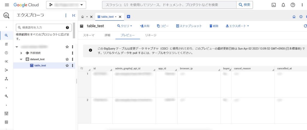 念の為Google BigQueryのコンソール画面から確認してみると、たしかにデータが転送されていることが確認できます。