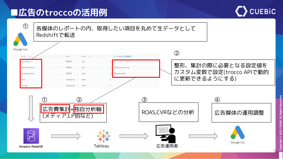 尾﨑勇太 氏:「たとえば、GoogleやYahoo!といった広告媒体から毎日の広告の運用レポートを取得した際に、独自の分析項目をカスタム変数に設定し、広告媒体別に異なるレポート項目を共通化して、生データをRedshiftに送ります。
