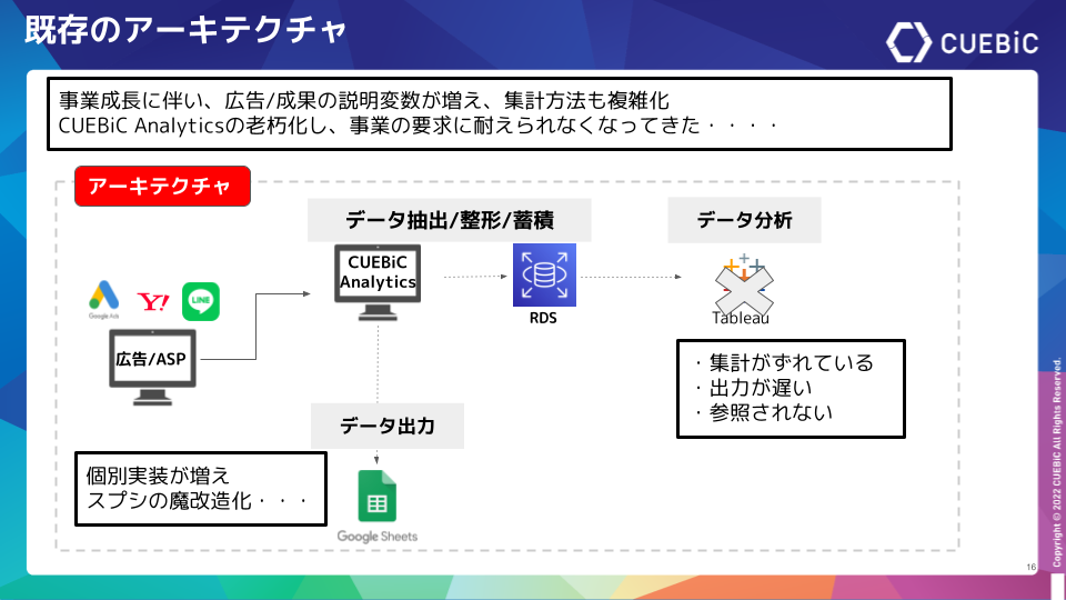 尾﨑勇太 氏:「社内データ基盤であるCBA(CUEBiC Analytics)の担当範囲は、広告媒体とASP(Affiliate Service Provider)からの成果レポートの収集と整形、BIツールへの分析データの可視化です。CBAの老朽化によりビジネス要求に分析基盤が耐えられなくなってきたため、DX戦略の一環としてデータウェアハウス化を推進することになりました。リソース課題としてもRubyエンジニアのアサインが単価の高騰によりネックになっていたため副次的にローコード化を行いスキルの軟化を図りました。